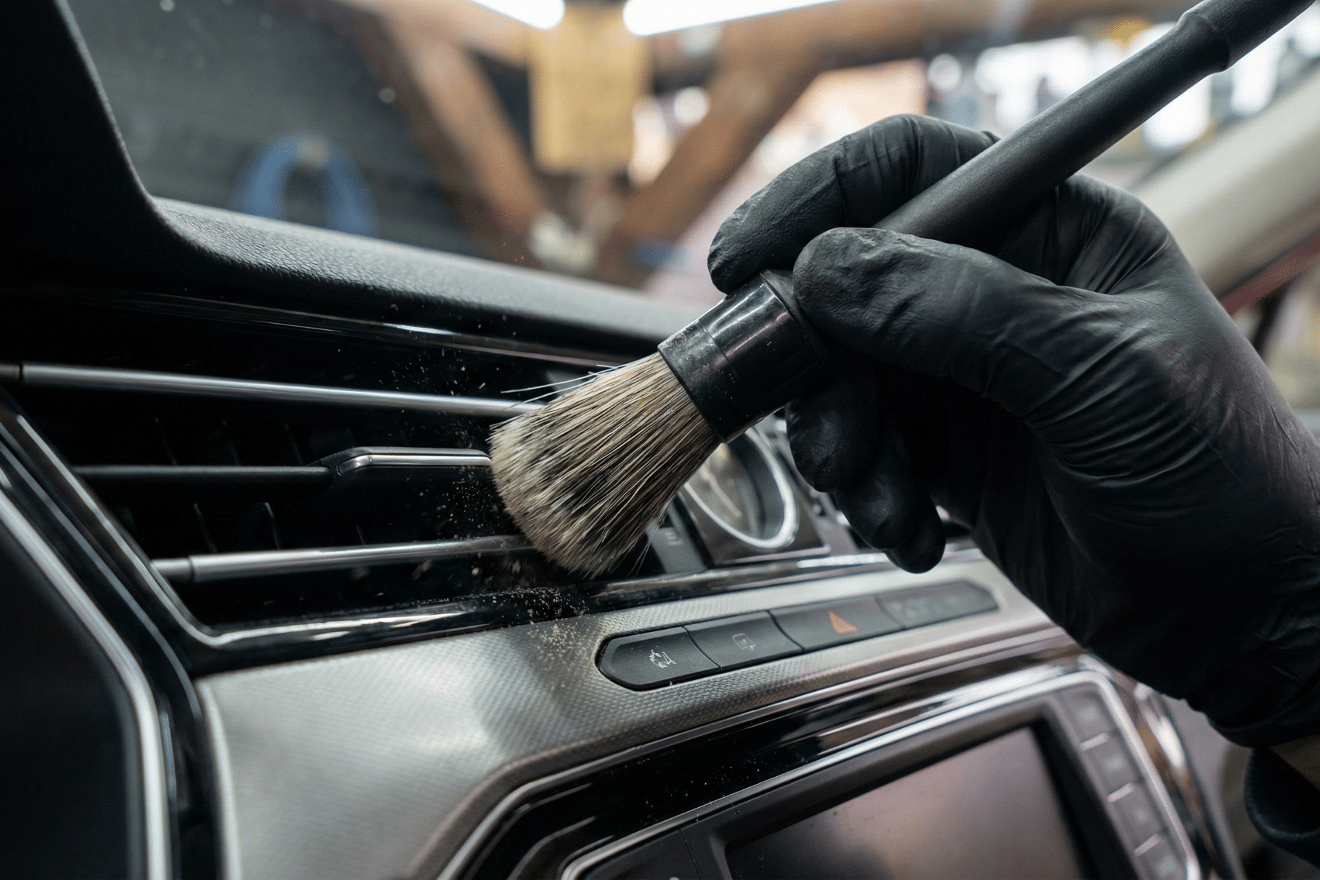 Részletes belső porszívózás, műszerfal, műanyagok és ajtók finom ecsetes portalanítása, minden felület zsírtalanítása és professzionális ápolása. Tiszta, csíkmentes ablakok, ajándék hidrofób szélvédőbevonattal, a végén pedig választható illatosítás, hogy az autó friss és újszerű legyen.